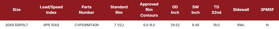 | 30X9.50R15LT | 6PR 104Q | CVPSWMT40R | 7 1/2J | 6.0-8.0 | 29.52 | 9.46 | 19.0 | RWL | N |