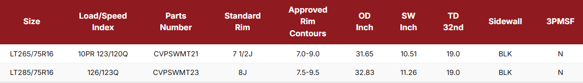 | LT285/75R16 | 126/123Q | CVPSWMT23 | 8J | 7.5-9.5 | 32.83 | 11.26 | 19.0 | BLK | N |