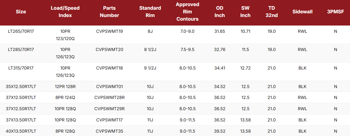 | LT265/70R17 | 10PR 123/120Q | CVPSWMT19 | 8J | 7.0-9.0 | 31.65 | 10.71 | 19.0 | RWL | N |