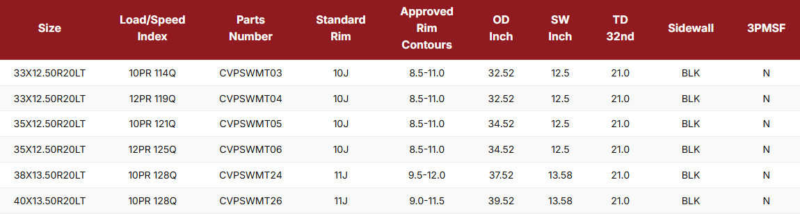 | 35X12.50R17LT | 12PR 128R | CVPSWMT01 | 10J | 8.0-10.5 | 34.52 | 12.5 | 21.0 | BLK | N |